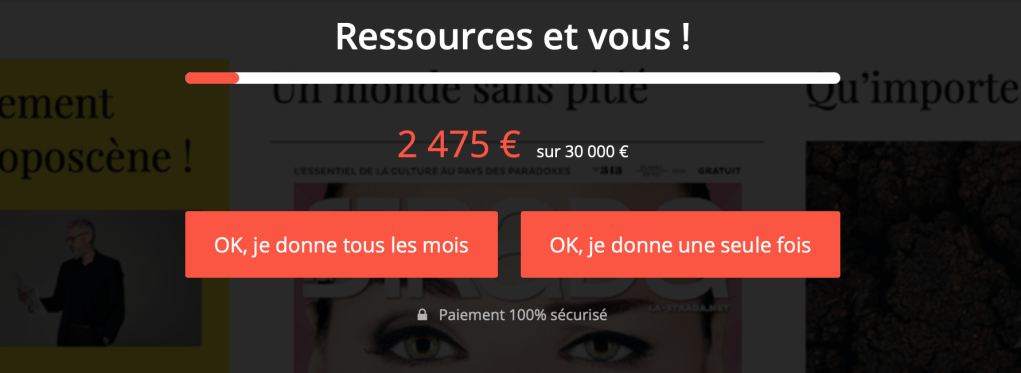 Un dernier point : nos contenus on-line ne sont pas payants. A l’instar de Reporterre.net, nos moyens seront ceux que nos lecteurs voudront bien nous donner. Sous forme de don ponctuel ou mensuel. Pour reprendre l’esprit des « contributions » dont parle Geneviève Fontaine : non pas réfléchir à combien vous pensez que ça vaut, mais à quelle hauteur vous souhaitez (vous) investir pour que ça dure. Parce qu’un média indépendant, vous le savez, ça peut aussi être une poche de résilience…